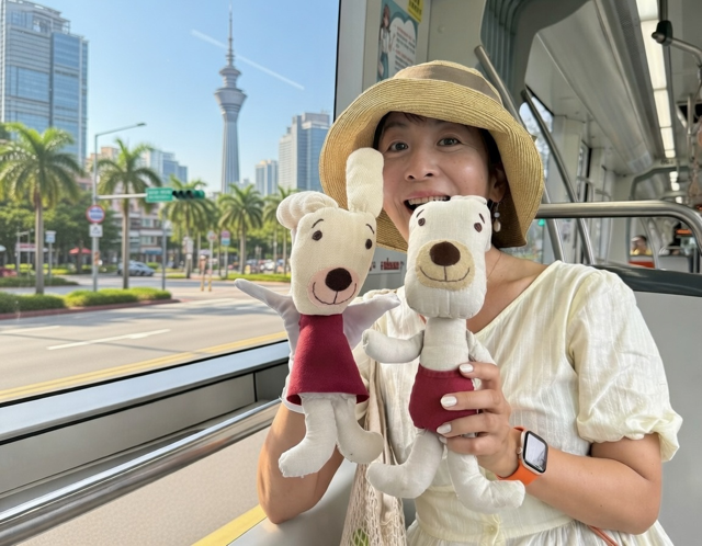 教材に登場するキャラクターのナナちゃんとロッキーと世界中を旅しています。